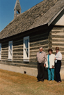 Three Barr Colony descendants stand beside the church where Lynne's grandparents were