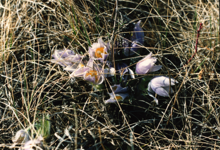 Crocuses peek through prairie wool, on land belonging to Lynne's cousin, near Lloydminster. The land has never been broken.