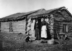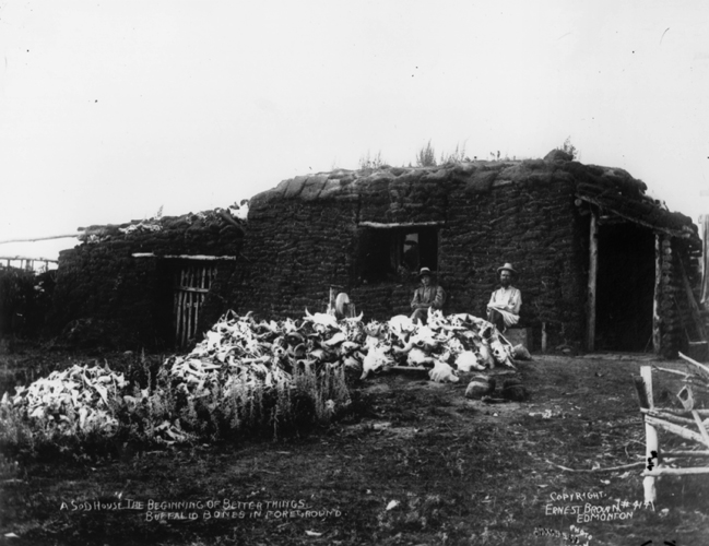 Two bachelors survey the buffalo bones they have collected to sell. Their sod house is unusual because it has a glass window. Prov. Archives of Alberta