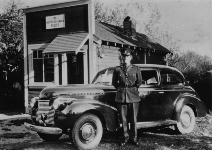 Constable Smokey Parsley stands in front of the Lake Cowichan police station in the 1940s before the explosion destroyed it. |