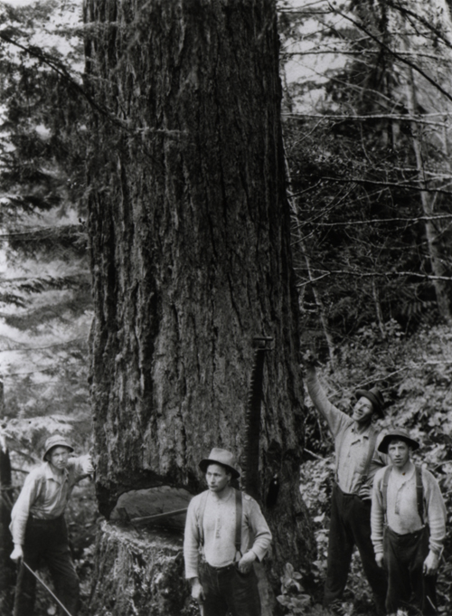 Cowichan Lake loggers prepare to fell a tree before power saws and hard hats changed logging in the 1940s. Kaatza Station Museum |