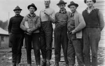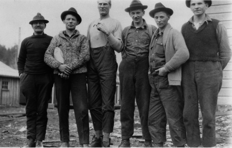 Swedish and Finnish loggers pose in Cowichan Lake logging camp in 1926. Kaatza Station Museum |